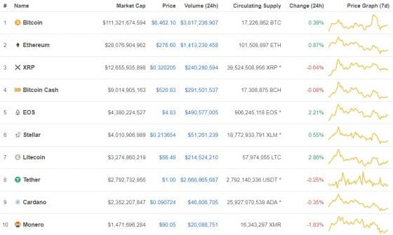 코인마켓캡에 따르면, 비트코인 가격은 뉴욕시간 오후 3시56분 기준 6462.10달러로 전일비(24시간 전 대비) 0.39% 올랐다. 이더리움은 0.87% 상승한 276.60달러에 거래됐다.