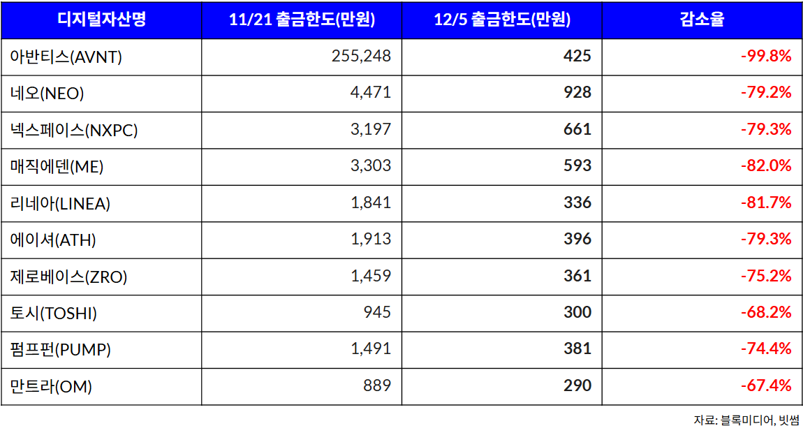 가장 큰 폭의 조정은 아반티스(AVNT)에서 발생했다. 지난달 21일 약 25억5000만원이던 출금 한도는 이달 5일 약 425만원으로 급감했다. 보름 만에 총 한도의 99.8%가 줄어든 것이다.