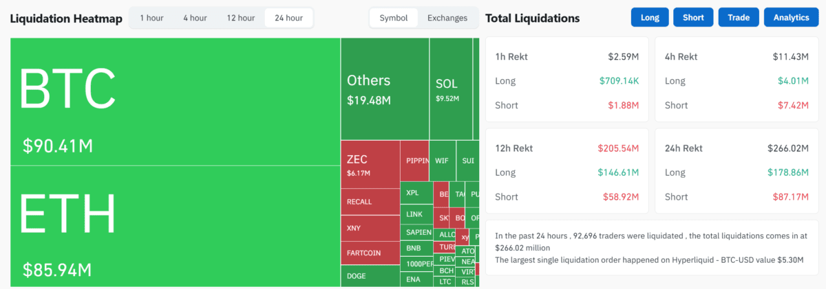 한편 24시간 누적 기준으로는 총 9만2696건의 포지션이 청산됐고, 단일 최대 청산은 하이퍼리퀴드(Hyperliquid) 거래소의 BTC-USDT 롱 포지션으로, 약 530만달러 규모였다.