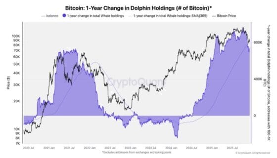 6일(현지시각) 훌리오 모레노 크립토퀀트(CryptoQuant) 리서치 총괄은 ‘돌고래(dolphins)’ 투자 계층의 잔고 변화가 비트코인 시장 전환을 가리키는 지표가 되고 있다고 밝혔다. 돌고래는 100~1,000BTC를 보유한 중간 규모 투자자 그룹을 의미한다. 모레노는 이러한 흐름을 “새로운 약세장 신호”라고 평가했다.