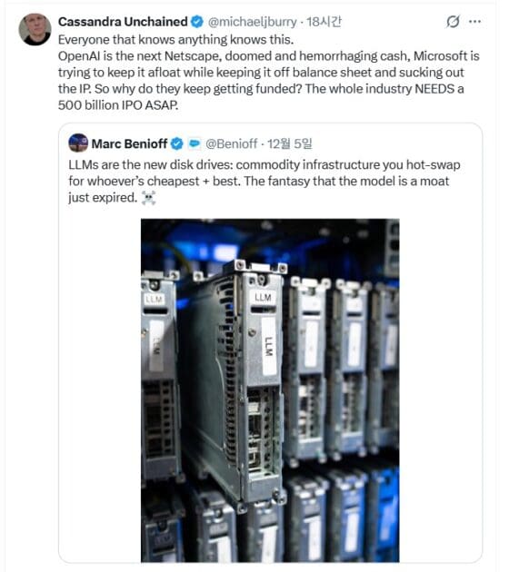 버리는 “아는 사람은 다 아는 사실”이라며 “오픈AI는 차기 넷스케이프와 같다. 현금이 고갈되어 죽어가고 있다”고 강도 높게 비판했다.