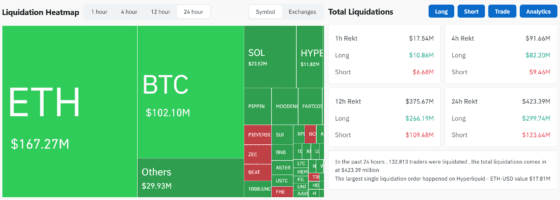 코인글래스(Coinglass)에 따르면 최근 24시간 기준 전체 청산 규모는 4억2467만달러에 달하며, 13만2628명의 트레이더가 포지션을 강제 종료당한 것으로 집계됐다.
