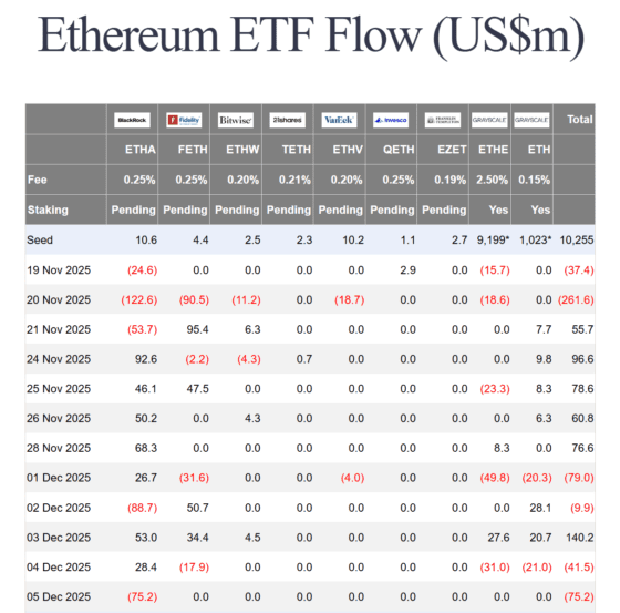 이더리움 ETF는 이날도 약세를 이어갔다. 12월 5일 기준 7520만달러의 순유출이 발생했으며, 이는 모두 블랙록 ETHA에서 이탈한 자금으로 확인됐다. 나머지 ETF에서는 뚜렷한 유입·유출 없이 보합세를 보였다.