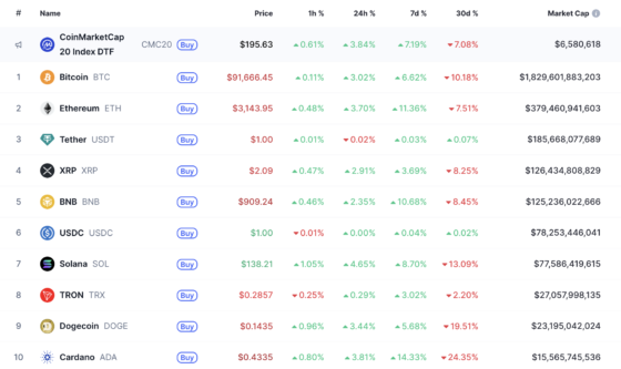 디지털자산 시황 중계 플랫폼 코인마켓캡에 따르면 상위 10개 디지털자산은 상승세를 보였다. 비트코인(BTC)은 9만1666달러로 지난 24시간 동안 3.02% 올랐다. 이더리움(ETH)은 3144달러로 3.70% 상승했다. 엑스알피(XRP)는 2.91%, 바이낸스코인(BNB)은 2.35% 올랐다. 솔라나(SOL)는 4.65% 상승했다.