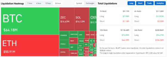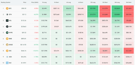 이외 솔라나(SOL)·지캐시(ZEC) 등 높은 변동성 종목의 청산 비중이 두드러졌다. ZEC에서는 1447만달러, SOL에서는 1412만달러가 청산됐다. 두 종목 모두 숏 포지션이 더 큰 타격을 입었다.
