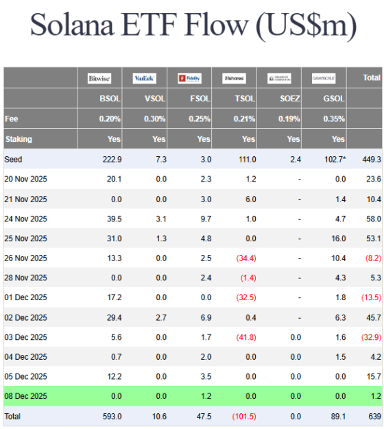 솔라나(SOL) ETF 시장은 12만달러(약 1764만원) 유입에 그치며 사실상 보합세를 보였다. 유일하게 피델리티 FSOL만 순유입을 기록했으며 나머지 ETF들은 전 거래일에서 변동이 없었다.