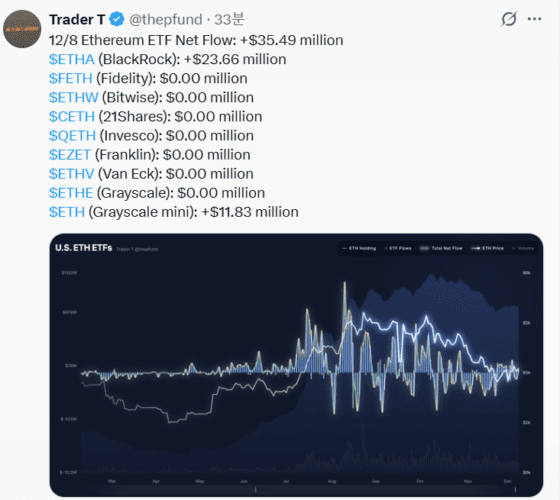 ETH ETF 시장은 블랙록의 견인 하에 총 3549만달러(약 5227억원)가 유입되며 전 거래일(7520만달러 유출)에서 상황이 반전됐다. 시장의 전체 유입액이 블랙록 ETHA와 그레이스케일 ETH 2종에 편중됐다. 블랙록 ETHA에는 2366만달러(약 3488억원), 그레이스케일 ETH에는 1183만달러(약 1737억원)가 각각 들어왔다.