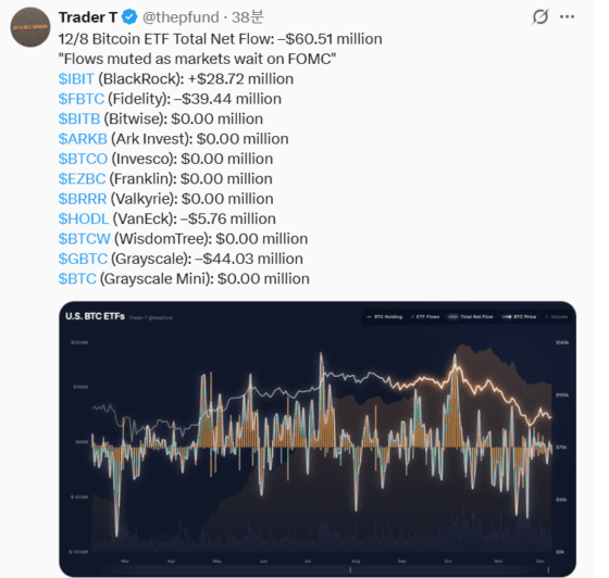 8일(현지시각) 트레이더T 및 파사이드 인베스터즈에 따르면, BTC ETF 시장에서는 이날 총 6051만달러(약 889억원)가 빠져나갔다. 전 거래일(5일)에는 5480만달러(약 806억원)가 유입됐으나 이날은 순유출로 집계됐다.