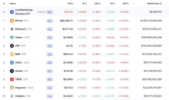 디지털자산 시장은 전반적으로 하락세를 나타냈다. 디지털자산 시황 중계 플랫폼 코인마켓캡에 따르면 전체 시가총액은 전일 대비 0.88% 감소한 3조900억달러(약 4544조원)로 집계됐다.