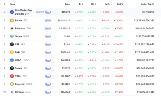비트코인(BTC)은 9만2038달러로 하루 새 1.70% 올랐다. 이더리움(ETH)은 3329달러로 6.63% 상승했다. 바이낸스코인(BNB)는 0.45%, 솔라나(SOL)는 3.77% 올랐다. 도지코인(DOGE)과 카르다노(ADA)는 각각 3.07%, 2.78% 상승했다. 반면 엑스알피(XRP)와 트론(TRX)은 각각 0.48%, 0.68% 하락했다.