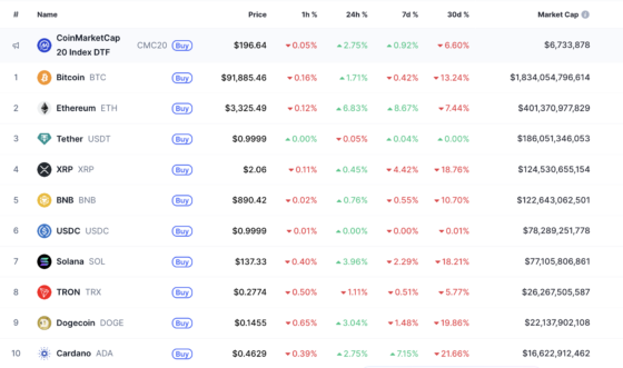 비트코인(BTC)은 지난 24시간 동안 1.71% 오른 9만1885달러에 거래됐다. 이더리움(ETH)은 3325달러로 6.83% 상승했다. 엑스알피(XRP)와 바이낸스코인(BNB)은 각각 0.45%, 0.76% 올랐다. 솔라나(SOL) 가격은 3.96% 증가했다. 도지코인(DOGE)은 3.04%, 카르다노(ADA)는 2.75% 상승했다. 트론(TRX)은 1.11% 상위 10개 디지털자산 중 유일하게 하락세를 보였다.