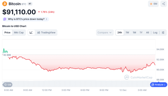 비트코인은 전일 대비 1.76% 내린 9만1110달러에 거래됐다. 단기 지지선 근처에서 매수세가 유입됐지만 상승 모멘텀은 제한적이었다.