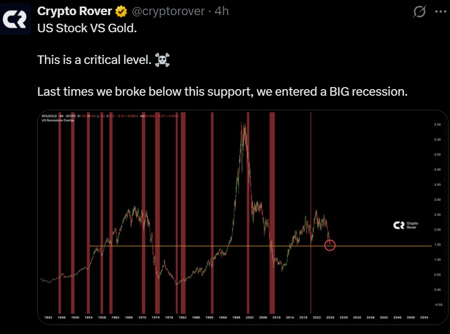 이 같은 위기론은 최근 일부 시장 지표에서도 반복적으로 제기되고 있다. 디지털자산 시장 분석가 크립토 로버는 미국 주식 대비 금 가격 비율이 장기 지지선 부근까지 하락했다며 과거 이 지표가 해당 수준을 하회했을 당시마다 미국 경제가 본격적인 침체 국면에 진입했다고 지적했다. 그는 현재 구간을 두고 “역사적으로 중요한 임계 수준”이라고 표현하며 주식 시장의 상대적 약세와 경기 둔화 가능성에 대한 경계가 필요하다고 언급했다.