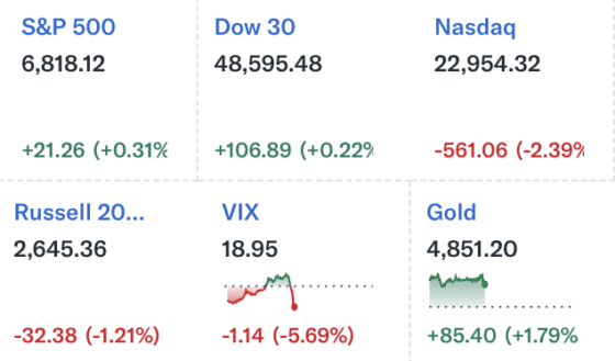 미 동부시간 21일 오전 9시30분 기준 뉴욕 증시는 지수별로 엇갈린 흐름을 나타냈다. S&P500 지수는 6818.12로 전 거래일 대비 0.31% 상승했다. 다우지수는 4만8595.48로 0.22% 올랐다. 반면 나스닥 지수는 2만2954.32로 2.39% 하락했다. 중소형주 중심의 러셀2000 지수는 2645.36으로 1.21% 내렸다.