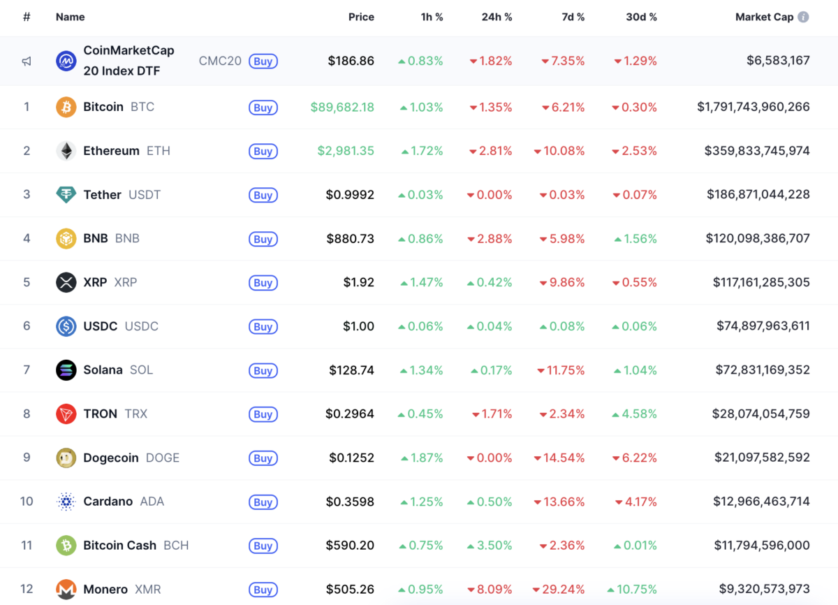 같은 시각 디지털자산 시장은 전반적으로 약세를 나타냈다. 비트코인(BTC)은 8만9682달러로 24시간 기준 1.35% 하락했다. 이더리움(ETH)은 2981달러로 2.81% 내리며 비트코인보다 낙폭이 컸다.