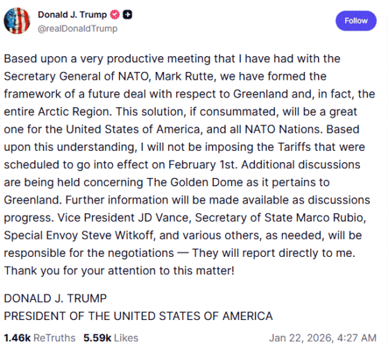 도널드 트럼프 미국 대통령은 22일(현지시각) 소셜미디어를 통해 “마르크 뤼터 나토 사무총장과 매우 생산적인 회담을 가졌고, 그린란드와 더 나아가 북극 전반에 대한 미래 합의의 프레임워크를 형성했다”고 밝혔다. 그는 “이 같은 이해를 바탕으로 2월1일부터 발효될 예정이던 관세를 부과하지 않기로 했다”고 말했다.