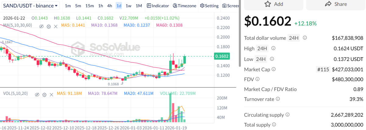 22일 오전(한국시각) 소소밸류에 따르면 SAND는 24시간 동안 12.24% 급등한 0.16달러에 거래되고 있으며 거래량은 전일 대비 113% 이상 급증했다. 같은 시각 비트코인은 9만달러 선 아래로 밀렸고 이더리움이 3000달러에서 등락을 거듭한 것과 대조를 이룬다.