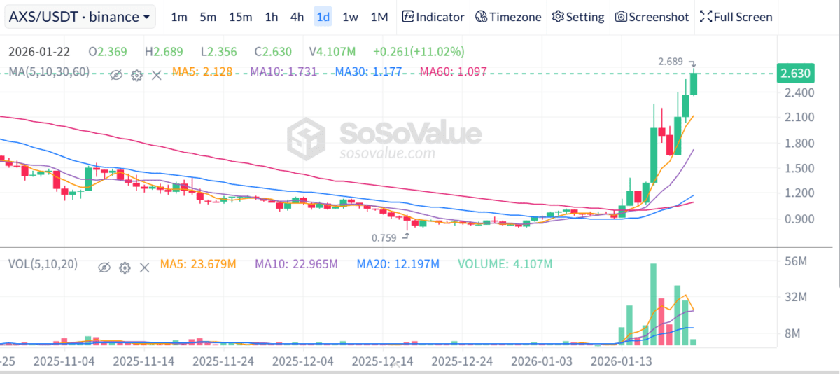 기술적으로도 뚜렷한 전환 신호를 보여준다. AXS는 지난해 하반기부터 이어진 하락 추세 속에서 0.75달러 부근까지 밀리며 장기간 저점을 다졌다. 이후 이달 초부터 거래량이 서서히 늘기 시작했고, 최근에는 단기 이동평균선을 연속으로 상향 돌파하며 일봉 기준 정배열 구간에 진입했다. 반등 과정에서 거래량이 동반 확대됐다는 점에서 단순한 숏커버링보다는 신규 매수 유입이 주도한 상승이라는 해석이 나온다.