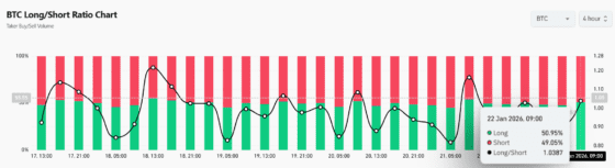 22일 코인글래스 4시간 기준 집계에 따르면, 비트코인은 롱 49.17%, 숏 50.83%로 집계됐다. 이날 오전 9시 롱/숏 비율은 1.0387로, 1.00을 소폭 상회하며 롱과 숏 포지션이 팽팽히 맞서는 모습을 보였다.