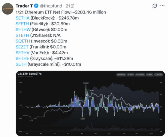 특히 블랙록 ETHA에서 2억4678만달러(약 3624억원)가 빠져나가며 유출세를 이끌었다. 이어 △피델리티 FETH -3089만달러(약 453억원) △반에크 ETHV -442만달러(약 65억원) △그레이스케일 ETHE -1138만달러(약 167억원) 등도 순유출에 기여했다. 다만 그레이스케일 ETH에는 1001만달러(약 147억원)가 유입되며 일부 상쇄 효과를 보였다.