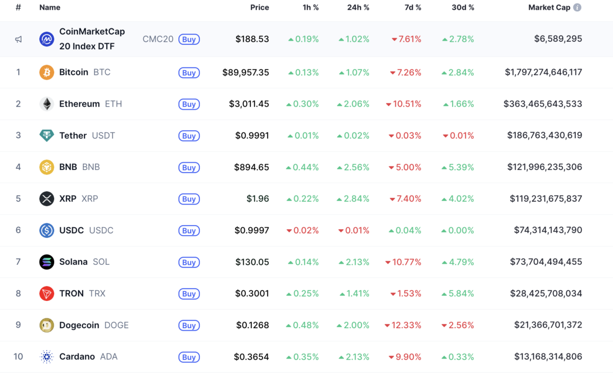 코인마켓캡에 따르면 22일 오후 7시 기준 디지털자산 시장 전체 시가총액은 3조400억달러로 24시간 기준 0.94% 증가했다. 같은 시각 비트코인은 8만9957달러로 1.07% 올랐고, 이더리움은 3011달러로 2.06% 상승했다.
