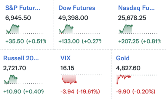 미 동부시간 오전 8시5분 기준 S&P500 지수 선물은 6945.50으로 전일 대비 0.51% 상승했다. 다우지수 선물은 4만9398.00으로 0.27% 올랐고, 나스닥 선물은 2만5678.25로 0.81% 상승했다. 러셀 2000지수 선물도 2721.70으로 0.40% 오르며 중소형주 투자심리도 개선되는 모습이다.