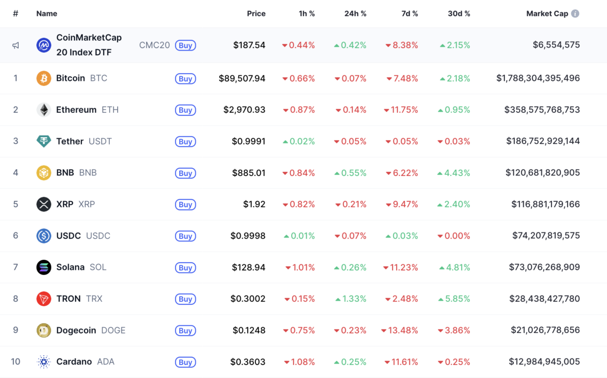 같은 시각 디지털자산 시장은 뚜렷한 방향성 없이 혼조세를 나타냈다. 디지털자산 시장 전체 시가총액은 3조400억달러로 24시간 기준 1.52% 증가했다. 비트코인(BTC)은 8만9508달러로 0.07% 하락했다. 이더리움(ETH)은 2971달러로 0.14% 내렸다.