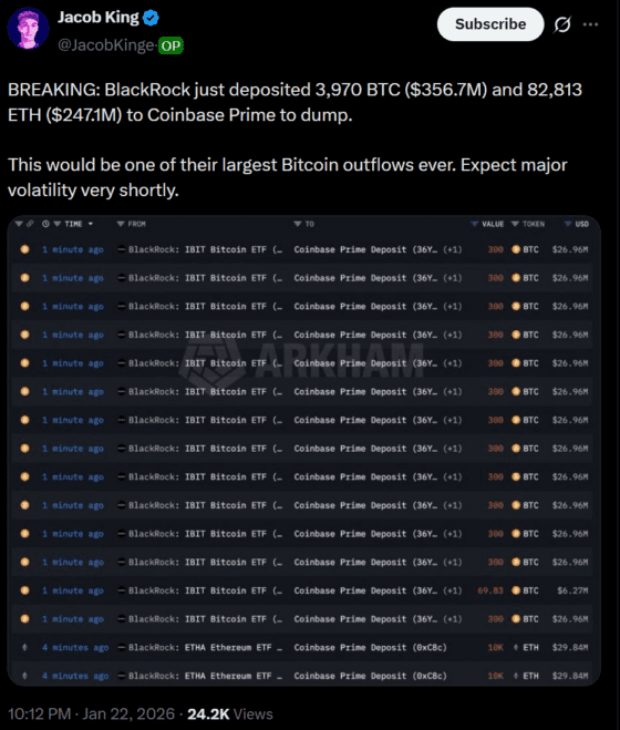 22일(현지시간) 디지털자산 분석가 제이콥 킹에 따르면 블랙록은 코인베이스 프라임으로 총 6억300만 달러 규모의 가상자산을 입금했다. 암호화폐 분석가 제이콥 킹은 아캄 인텔리전스 데이터를 인용해 블랙록이 약 3억5670만 달러 상당의 3970BTC와 2억4710만 달러 규모의 8만2813ETH를 이체했다고 분석했다. 이는 2026년 들어 단일 일자 기준으로도 손꼽히는 대규모 자금 이동으로 평가된다.