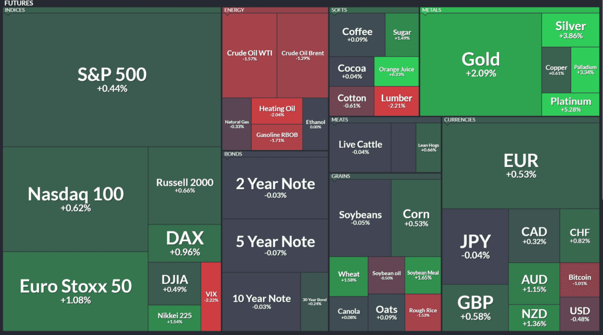 [블록미디어 명정선 기자] 23일(한국시각) 오전 7시 35분 기준 글로벌 선물시장은 간밤 뉴욕증시 상승 흐름을 뒤따르면서도 자산군별로 뚜렷한 차별화가 나타나고 있다. 금을 비롯한 귀금속과 일부 농산물로 자금이 강하게 유입된 반면, 비트코인은 거시 변수보다는 수급 구조 악화에 따른 매물 출회로 조정을 받았다. 최근 급등했던 에너지 가격은 차익 실현 압력 속에 숨 고르기 국면에 진입했으며, 외환시장에서는 달러 약세 흐름이 이어지고 있다.