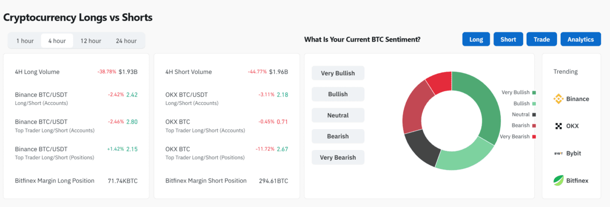 23일 코인글래스에 따르면 최근 4시간 기준 비트코인 파생시장에서 롱 포지션 거래대금은 약 19억3000만달러로 전일 대비 38% 감소했고 숏 포지션 거래대금도 44% 넘게 줄었다. 방향성 베팅이 동시에 위축되며 비트코인 시장이 뚜렷한 관망 국면에 진입했음을 보여준다. 같은 기간 비트코인의 롱·숏 비중은 49.6% 대 50.4%로 사실상 균형 상태를 유지했다.