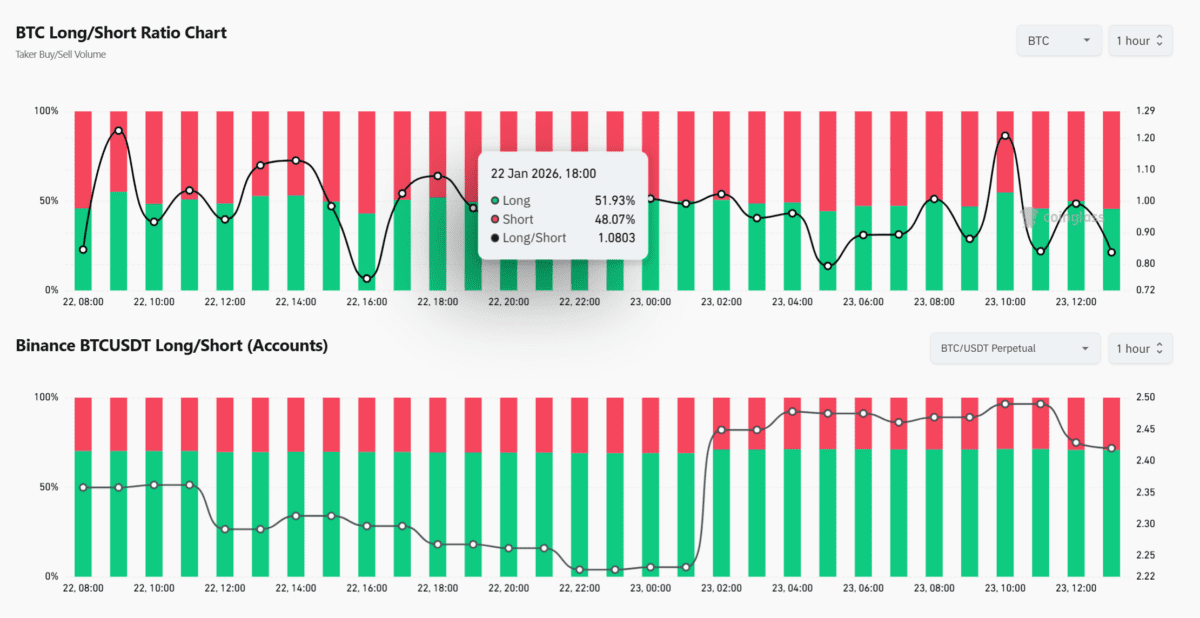 비트코인 롱·숏 비율 역시 단기적으로 1을 전후해 등락을 반복하고 있다. 가격 또한 좁은 박스권에서 움직이며 파생시장에서는 신규 레버리지 확대보다는 기존 포지션 유지와 미세 조정이 주를 이루는 모습이다.