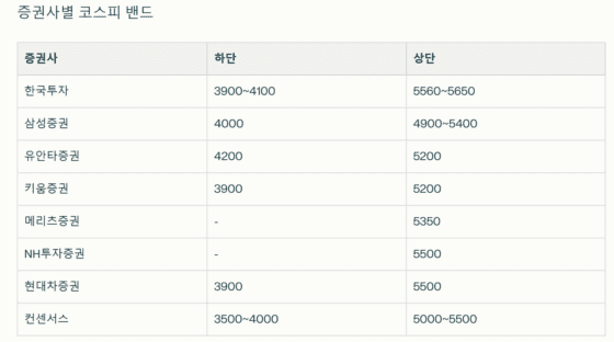 25일 금융업계와 디지털자산 업계에 따르면, 주요 8개 증권사에서 올해 코스피 향방으로 상고하저(상반기 상승 하반기 주춤 혹은 횡보)를 전망하며 밴드 컨센서스로 4900~5500를 제시했다.