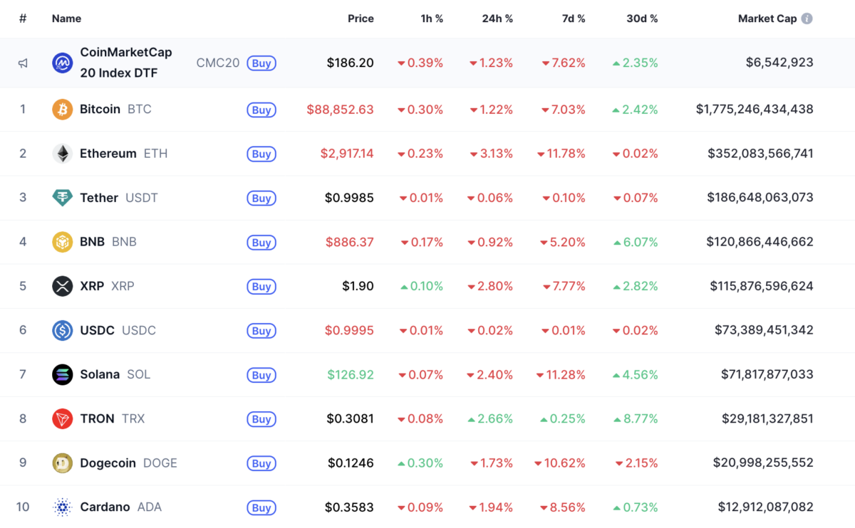 코인마켓캡에 따르면 23일 오후 7시 기준 디지털자산 시장 전체 시가총액은 3조300억달러로 24시간 기준 0.54% 줄었다. 비트코인은 8만8853달러로 1.22% 하락했고, 이더리움은 2917달러로 3.13% 내렸다.