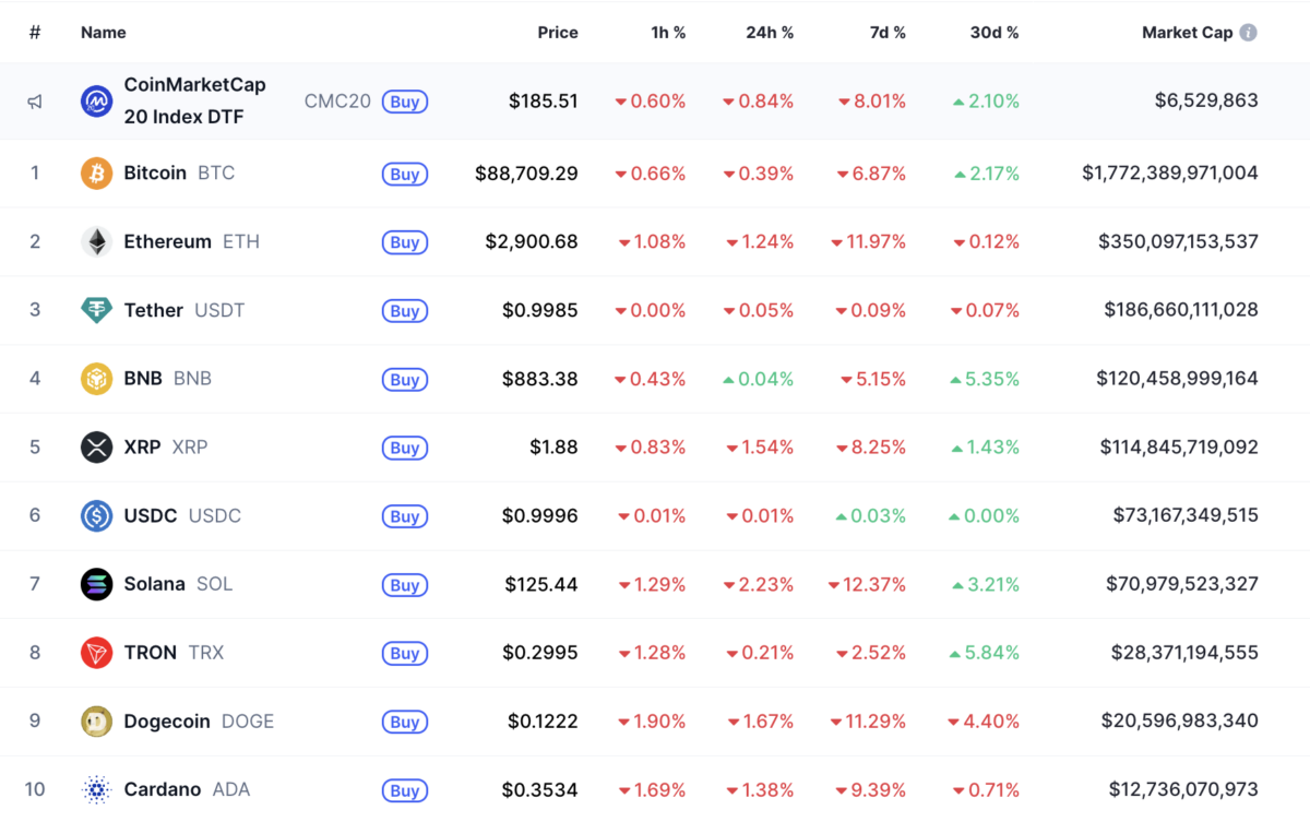 디지털자산 시장 전체 시가총액은 약 3조10억달러로 24시간 기준 0.15% 감소했다. 비트코인(BTC)은 8만8709달러로 0.39% 하락했다. 이더리움(ETH)은 2901달러로 1.24% 내렸다.
