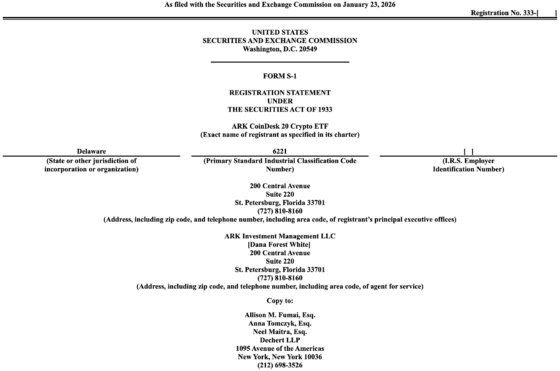 23일(현지시각) 미국 증권거래위원회(SEC) 제출 자료에 따르면 아크 인베스트는 ‘아크 코인데스크 20 크립토(ARK CoinDesk 20 Crypto) ETF’에 대한 S-1을 접수했다. 해당 ETF는 코인데스크 20 지수의 일간 성과를 추종하며 뉴욕증권거래소 아르카(NYSE Arca) 상장을 목표로 하고 있다.