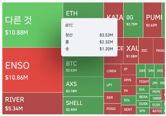 코인글래스에 따르면 지난 24시간 동안 비트코인 시장에서 약 353만달러(약 51억3000만원) 규모의 포지션이 청산됐다. 이 가운데 약 65.7%는 롱 포지션이었다. 전체 디지털자산 시장에서는 약 7877만달러(약 1145억5000만원) 규모의 청산이 발생했다.