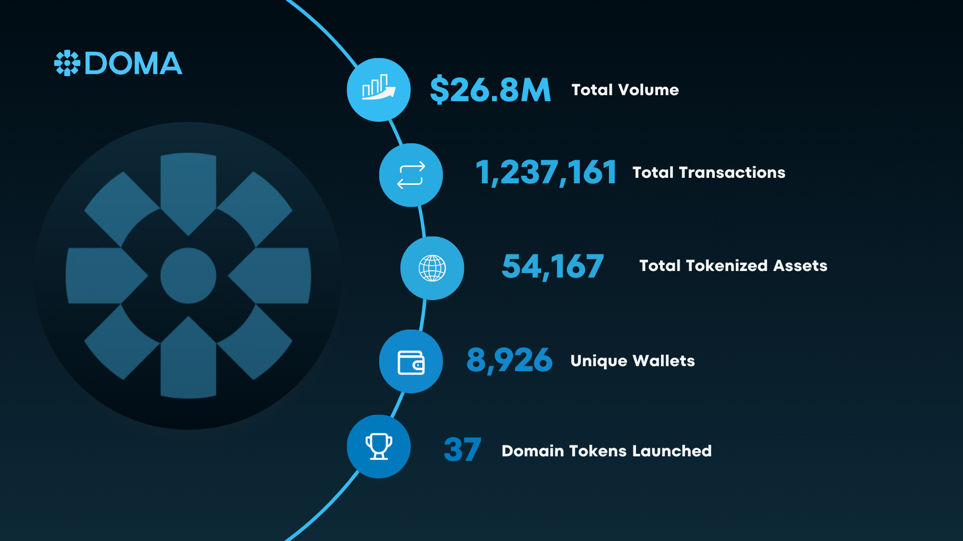 블로그에 공개된 주간 지표에 따르면 도마 프로토콜은 한 주 동안 2680만달러(약 386억원)의 총 거래량을 기록하며 활발한 온체인 활동을 입증했다. 해당 기간 총 트랜잭션 수는 123만7161건에 달하며, 총 토큰화 자산은 5만4167개로 집계됐다. 활성 지갑 수는 8926개이며 37개의 신규 도메인 토큰이 성공적으로 런칭됐다.
