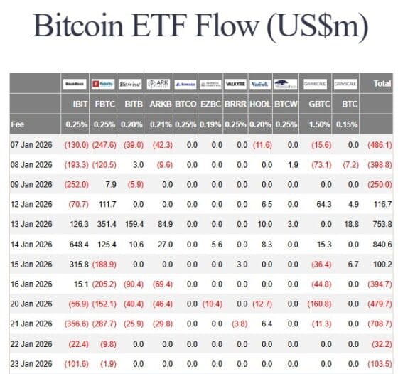 파사이드인베스터스 집계에 따르면 지난 23일 비트코인 ETF에서는 총 1억350만달러(약 1489억1600만원) 규모의 순유출이 발생했다. 이더리움 ETF 역시 같은 기간 4170만달러(약 599억9800만원)가 빠져나갔다. 최근 유출 국면과 비교하면 일일 규모는 제한적이었지만, 자금 방향성은 여전히 순유출 구간에 머물렀다.