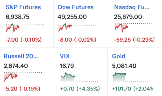 미 동부시간 26일 오전 8시 기준 S&P500 지수 선물은 6938.75로 전일 대비 0.10% 하락했다. 다우지수 선물은 4만9255.00으로 0.02% 내렸고, 나스닥 선물은 2만5679.00으로 0.23% 하락했다. 러셀 2000지수 선물도 2674.40으로 0.19% 떨어지며 중소형주 전반에서도 조정 흐름이 나타났다.