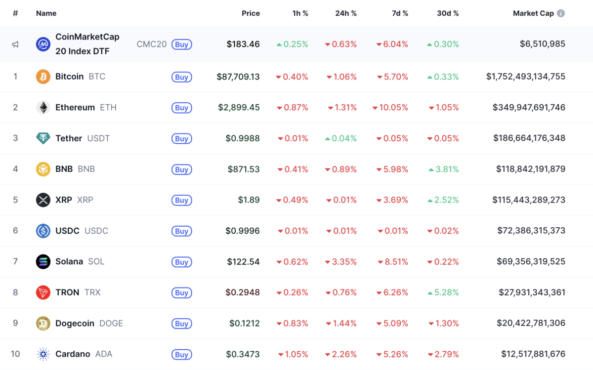 디지털자산 시장은 전반적으로 약세 흐름을 나타냈다. 전체 시가총액은 약 2조9600억달러로 하루 기준 1.05% 감소했다. 비트코인(BTC)은 8만7709달러로 1.06% 하락했고, 이더리움(ETH)은 2899달러로 1.31% 내렸다.