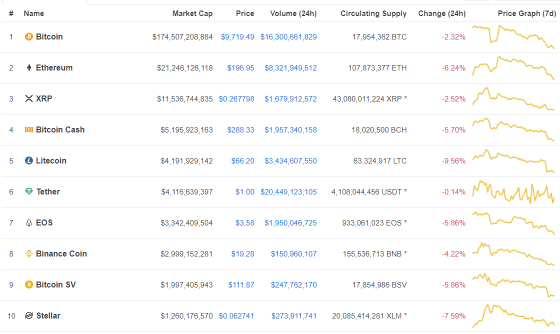 코인마켓캡에 따르면, 전반적인 하락세 가운데 비트코인 가격은 뉴욕시간 오전 9시 기준 9719.49달러로 2.32% 하락했다.
