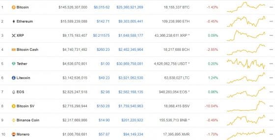 코인마켓캡 기준 국제 BTC 가격은 전날 대비 1.43% 내린 8,015달러에 거래되고 있다. 지난 8일 8,000 달러를 넘어선 이후, 등락을 거듭하고 있다. 현재는 점점 하락폭을 키우면서 8,000 달러 붕괴도 위협하고 있다. 특히 비트코인 계열 암호화폐인 BCH 가격은 3% 가까이 내리고 있으며, BSV 가격은 10% 넘는 하락폭을 보이고 있다.