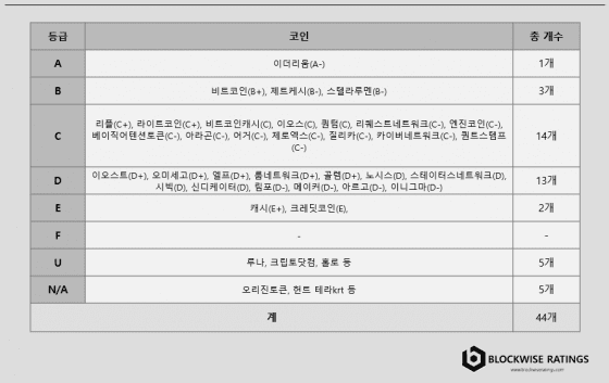 [블록미디어 황영훈 기자] 블록와이즈평가정보가 미국 신용평가 기관인 와이즈 레이팅스(Weiss ratings, 이하 와이즈)의 암호화폐 신용등급을 토대로 고팍스, 코인빗, 후오비코리아에 상장된 암호화폐를 분석한 결과 후오비코리아와 고팍스에 신용등급이 높은 코인이 가장 많았다. (국내 4대 거래소 대상 “암호화폐” 등급 평가 분석)