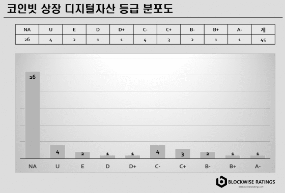 코인빗은 코인원과 등급 분포가 유사하다. C-등급 이상의 암호화폐가 24%이다. 이는 코인원보다 1% 더 높은 비율이다. 등급이 없는 암호화폐 비율도 코인원과 비슷한 67%를 보였다. 코인빗에는 코인원과 마찬가지로 위험요소가 높은 암호화폐가 많이 상장되어 있다.