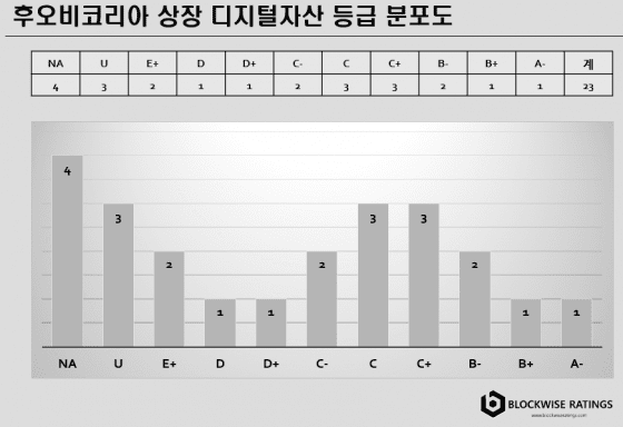 후오비코리아는 와이즈레이팅스 거래소 순위에 포함 되어있지는 않지만, 원화마켓 거래가 가능한 중국계 대형 거래소이다. 후오비코리아에 상장된 코인(원화마켓 기준)은 총 23개로 C-등급 이상의 코인이 12개로 52%, D+등급 이하의 코인이 4개로 17%, 등급이 파악되지 않은 코인은 7개로 31%를 차지하고 있다.