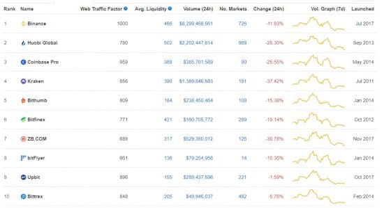 [표] 글로벌 암호화폐 거래소 거래량 톱10 (뉴욕시간 9월8일 오후 1시30분 기준)