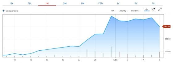 마이크로스트래티지 주가는 지난 6개월간 168% 상승했다. 그러나 이날 씨티뱅크의 투자 의견 하향 소식이 전해지면서 주가는 급락했다. 뉴욕 시간 오후 1시 18분 기준 이 회사 주가는 301.09달러로 10% 조금 넘게 떨어졌다.