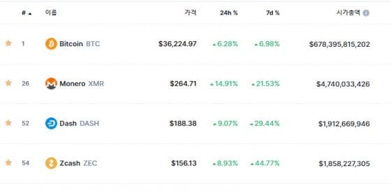 이런 상황 속에서 다크코인의 가격이 올랐어요. 31일 6시 기준으로 대표적 다크코인인 모네로가 21%, 대쉬가 29%, 지캐쉬가 45% 상승했어요.