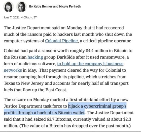 [블록미디어 프로메타연구소] FBI가 송유관 회사(콜로니알 파이프라인)에 랜섬웨어를 설치한 해커들로부터 피해금 일부를 회수했다는 뉴스가 나왔어요.
