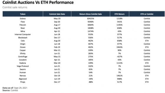 최고 수익률은 6만425%. 솔라나가 차지했습니다. 2020년 5월에 코인리스트에서 입찰이 있었는데요. 지금까지 솔라나를 가지고 있다면 얻을 수 있는 수익입니다. 같은 기간 이더리움에 투자했다면 얻게 되는 수익률은 1218% 입니다.